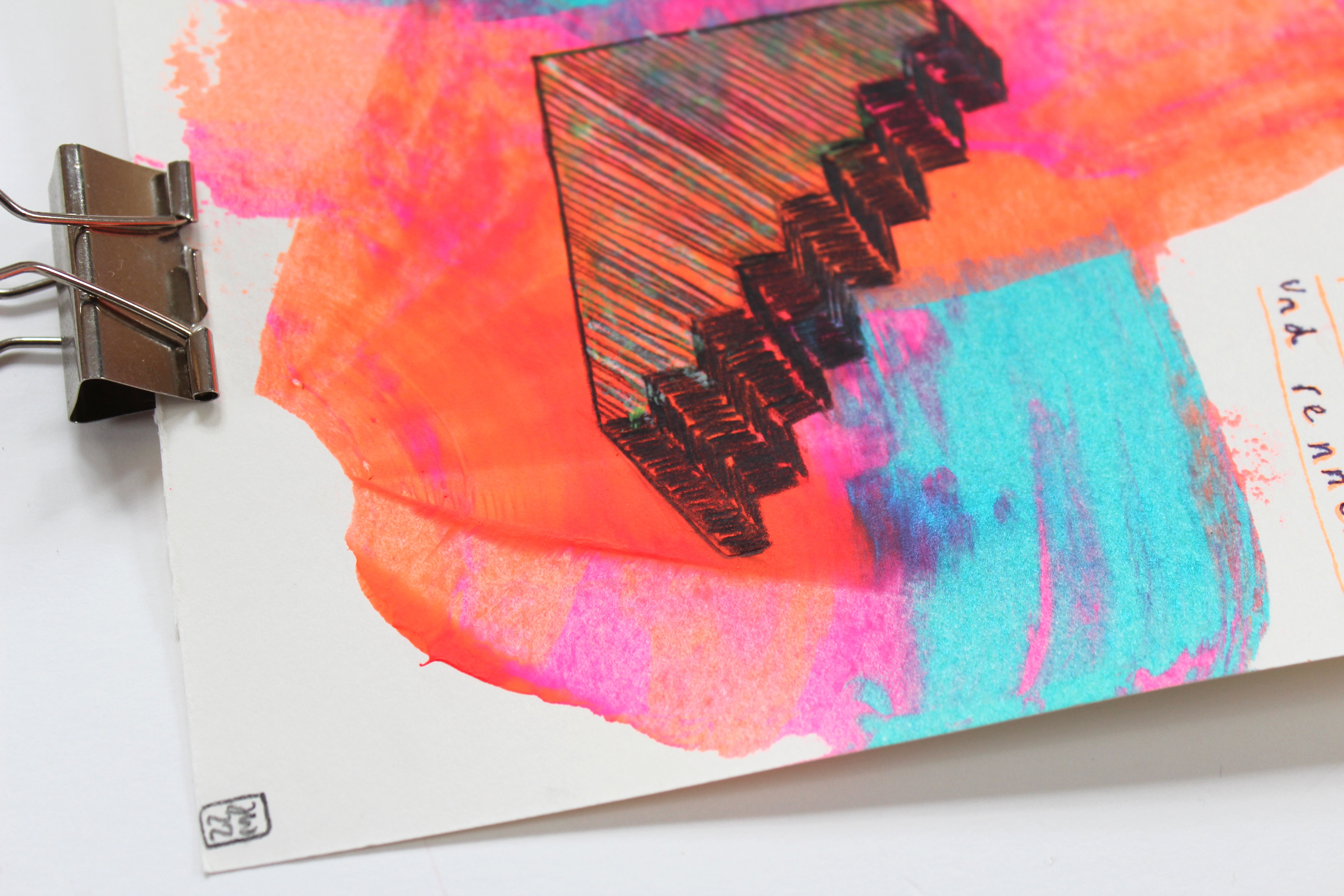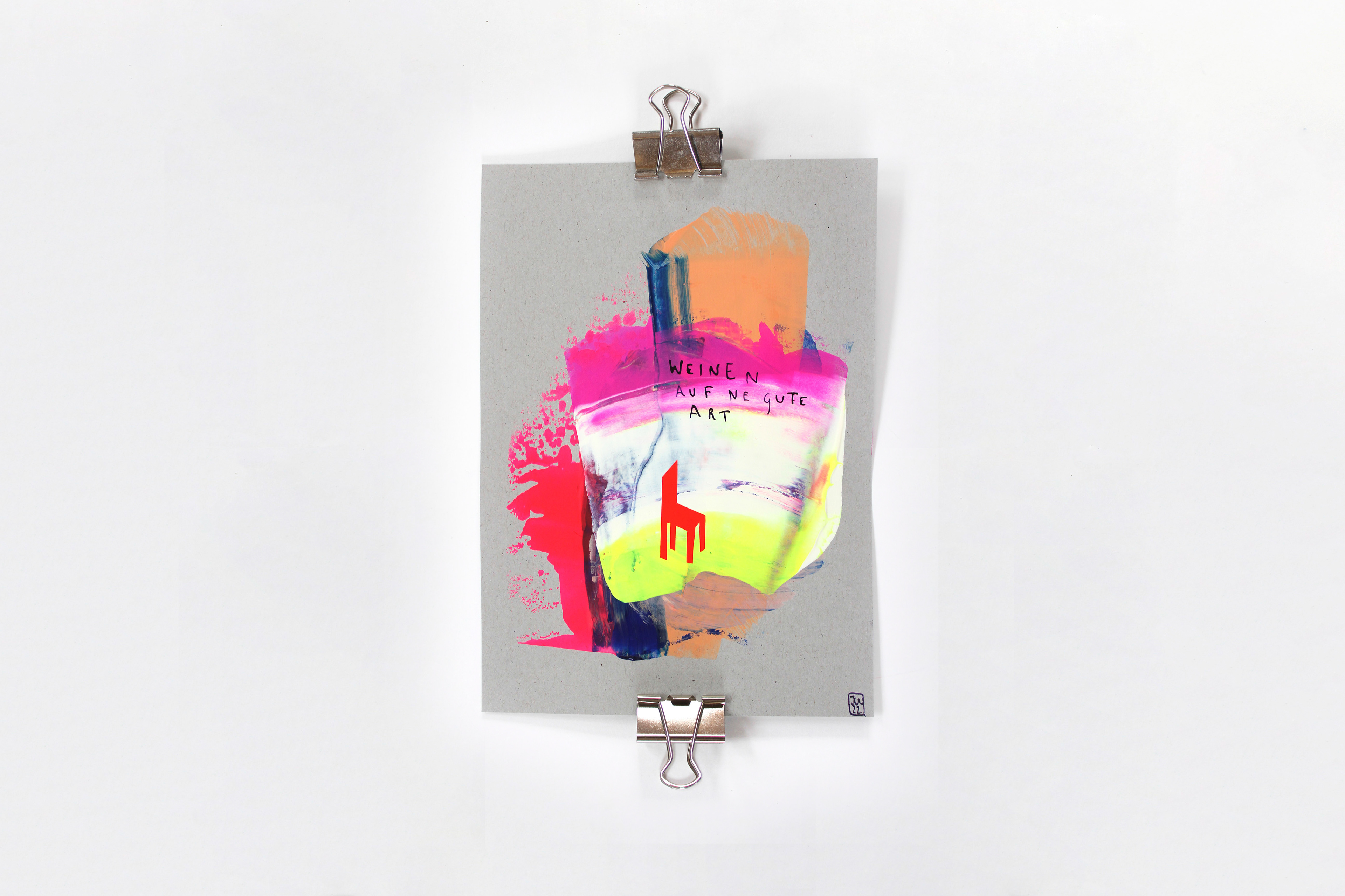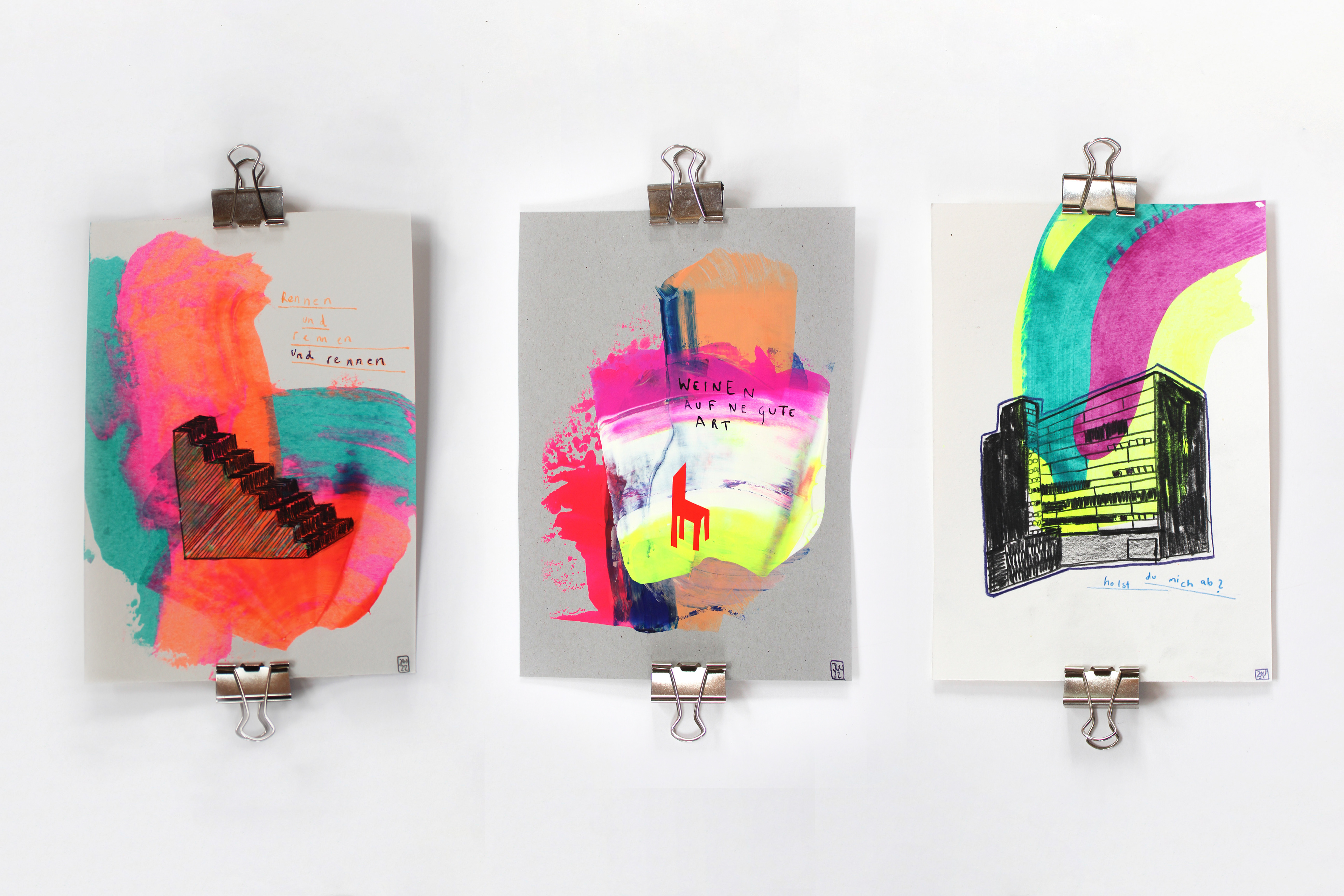 acryl, buntstift, tusche, neonfolie und ölkreide auf creme bzw. grauem papier