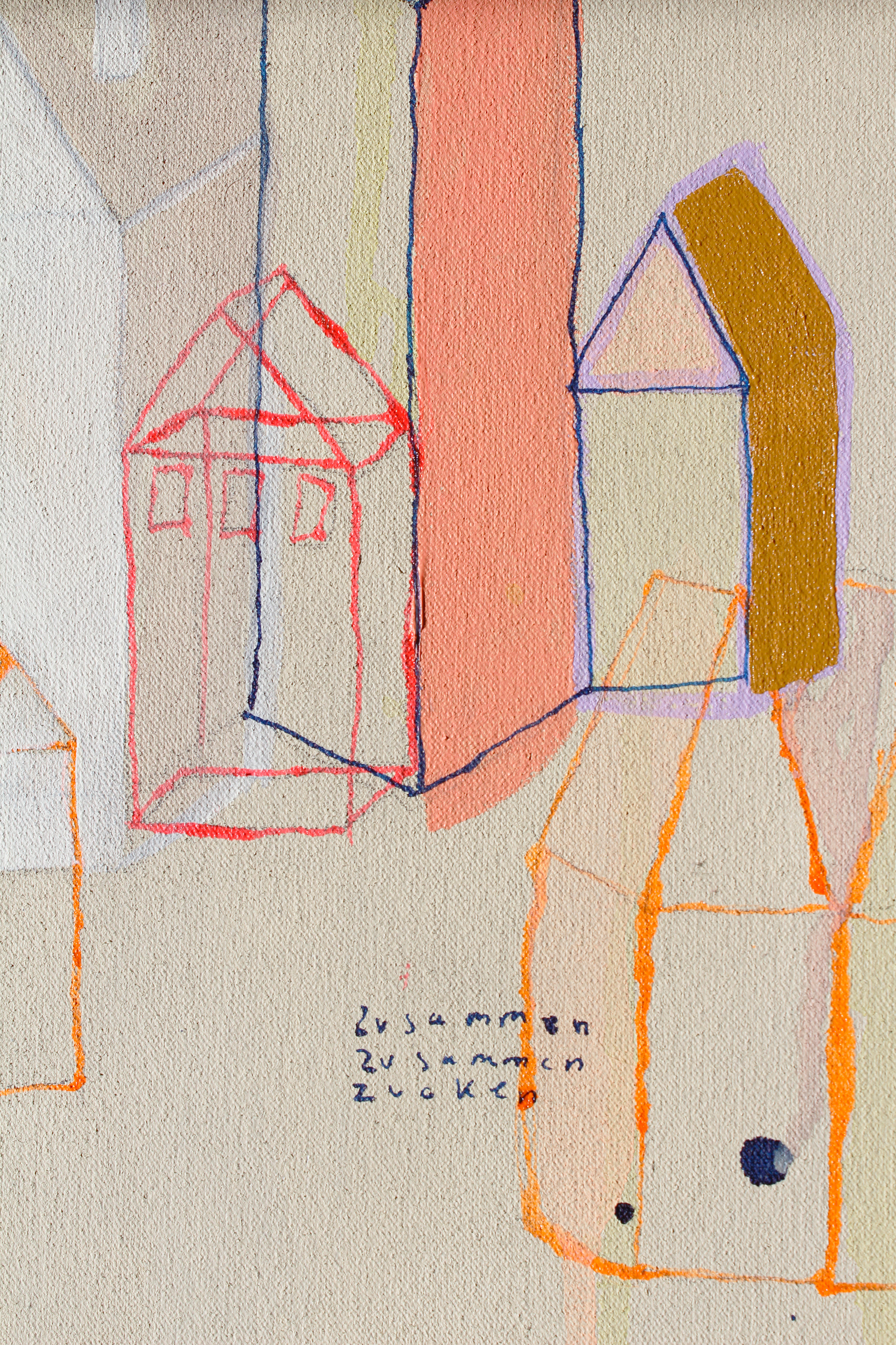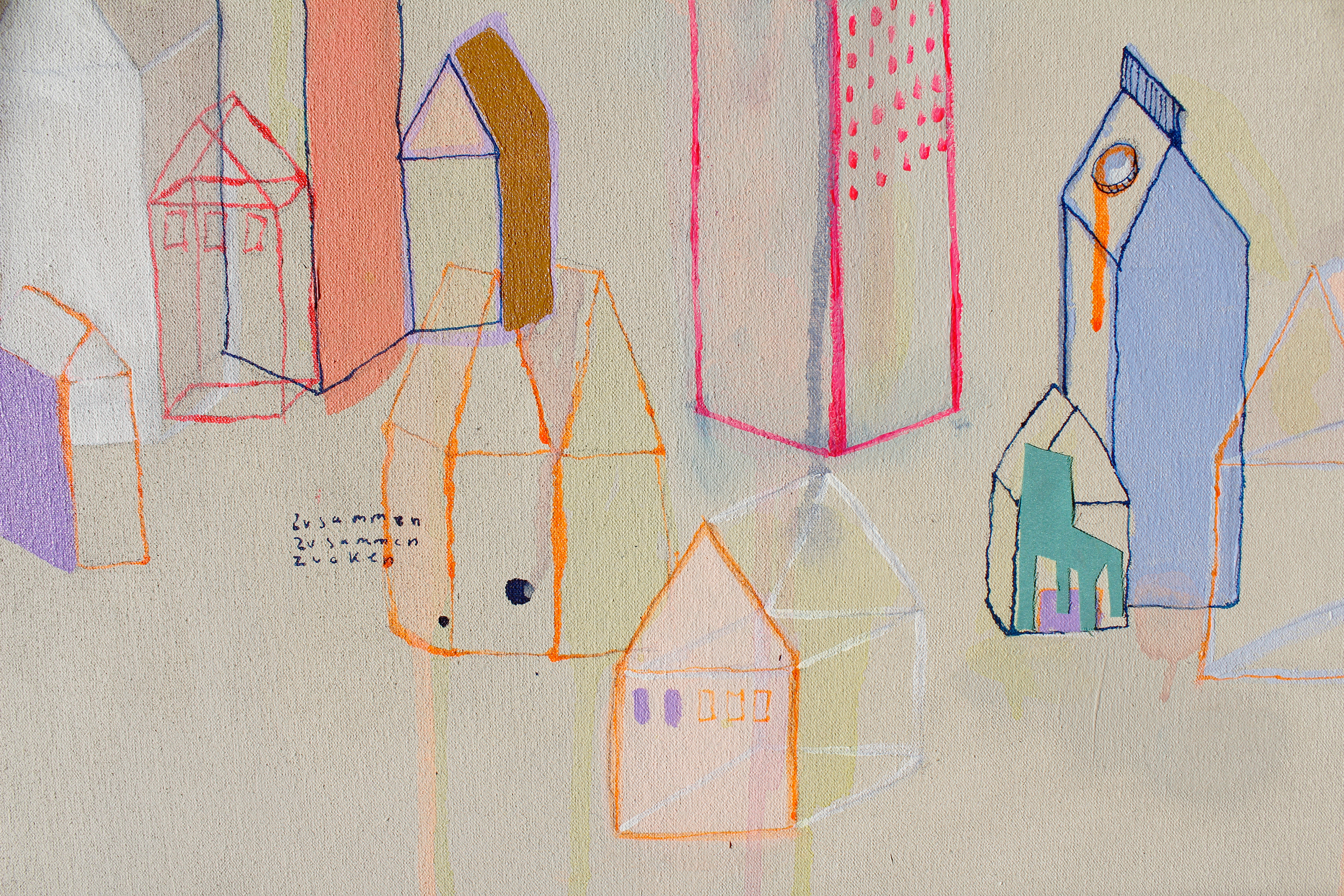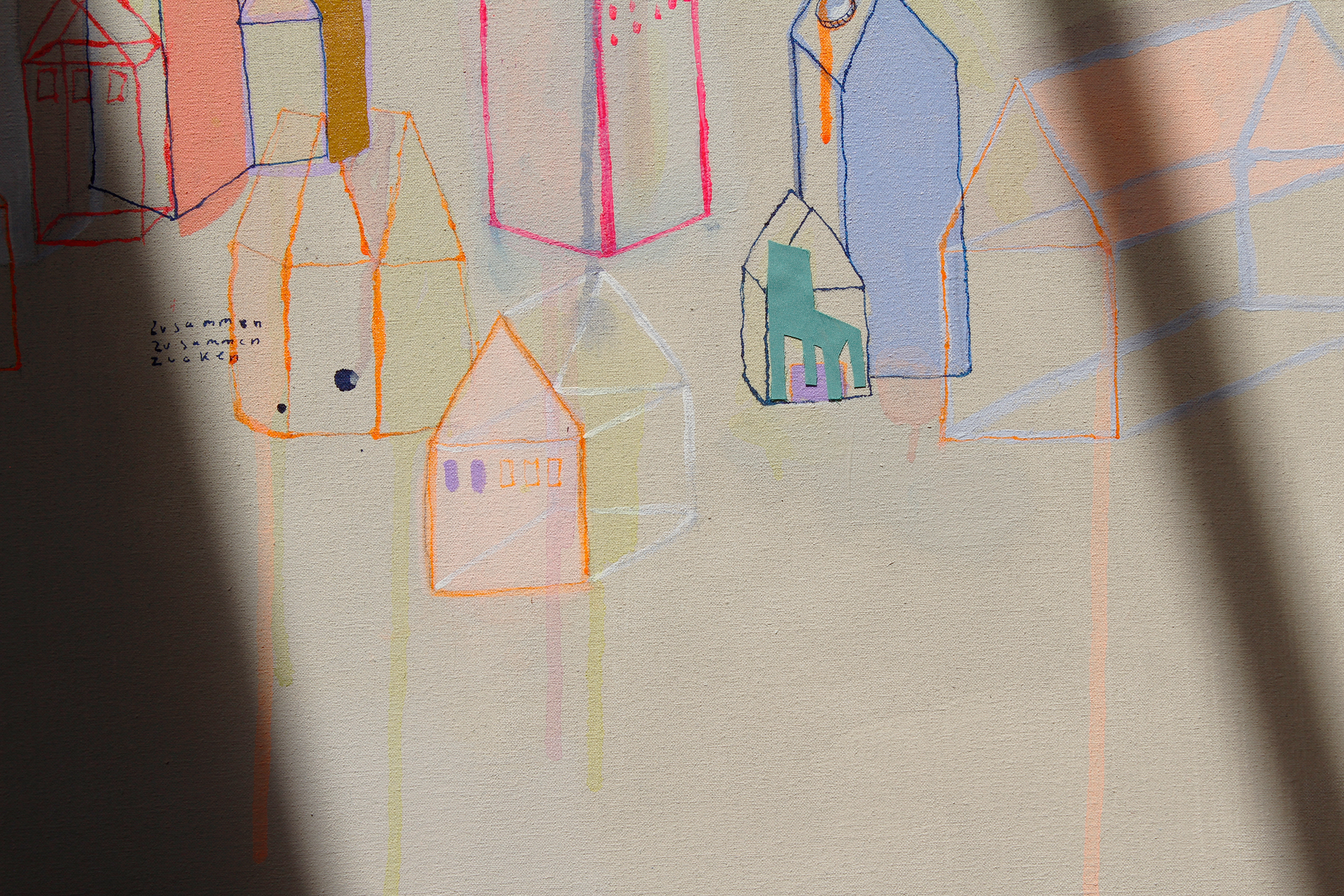 Acryl, Ölkreide, Tusche und Aquarell auf Baumwolle