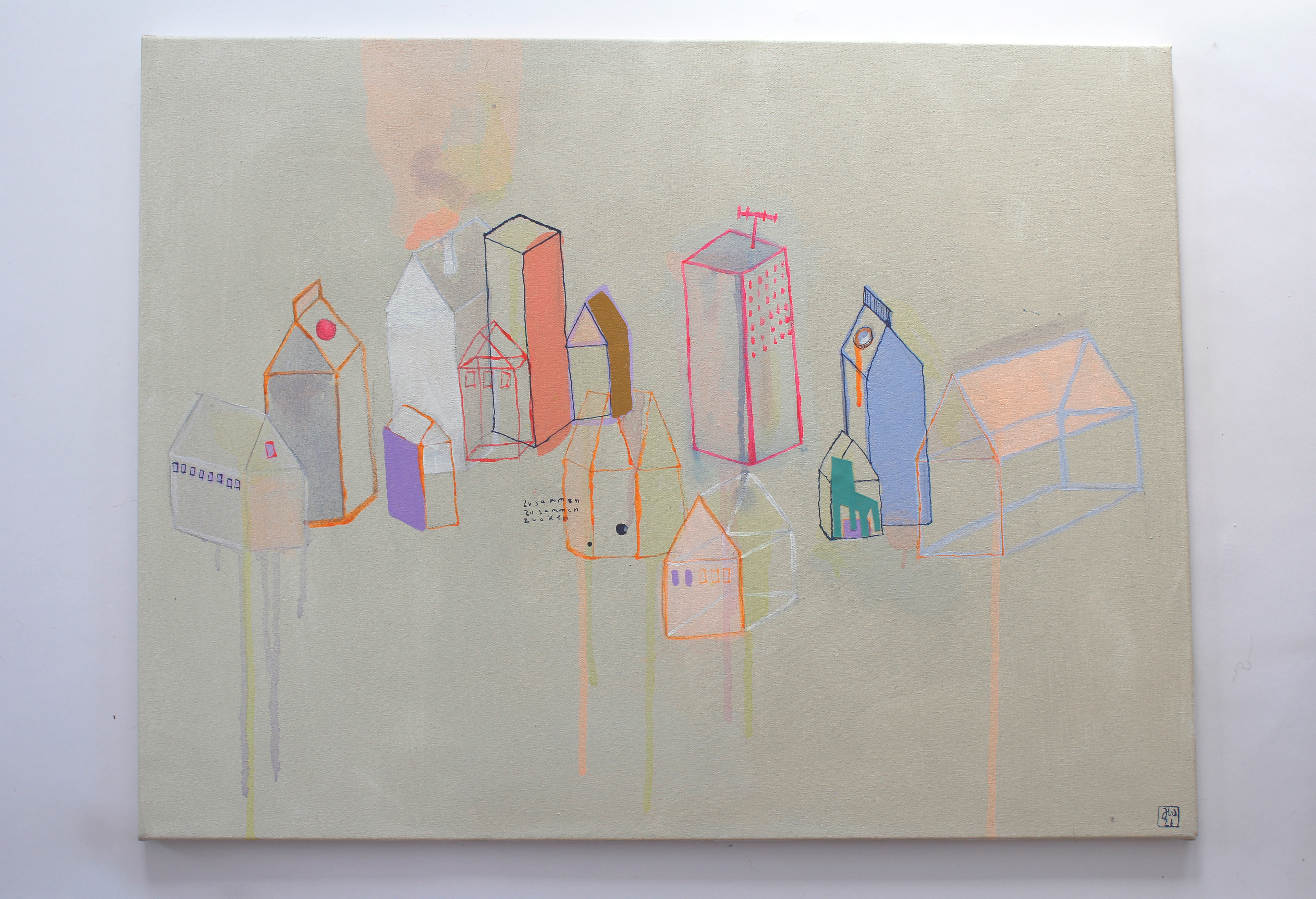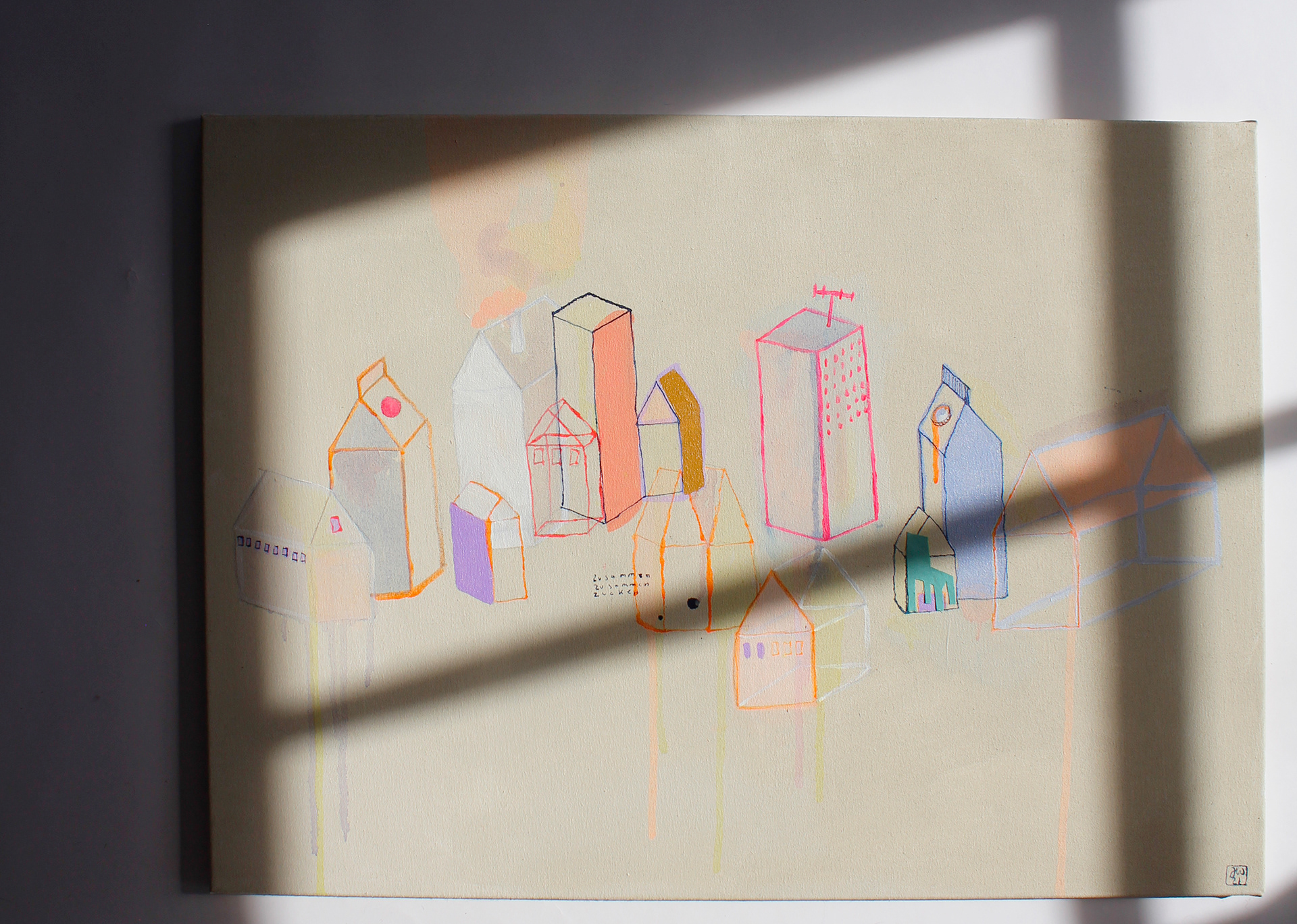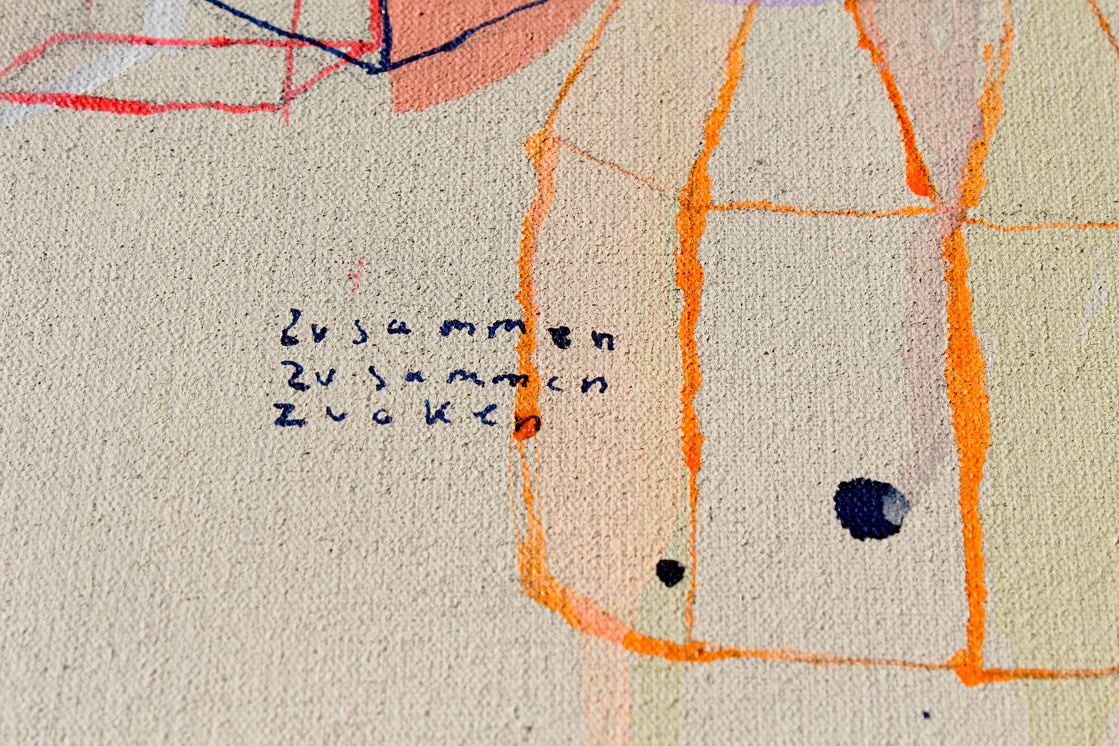 Acryl, Ölkreide, Tusche und Aquarell auf Baumwolle